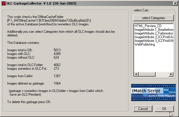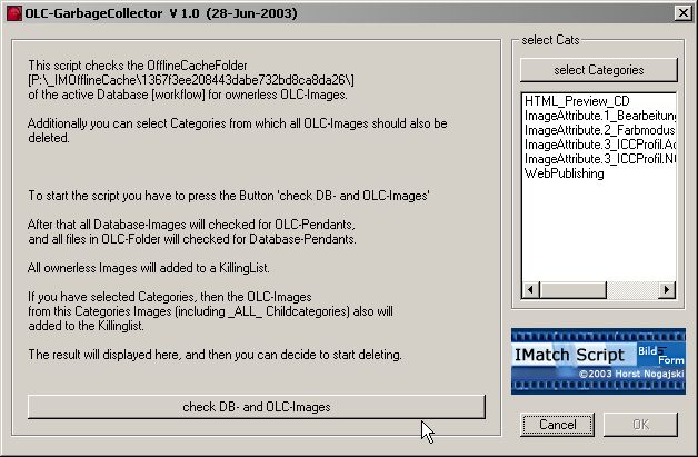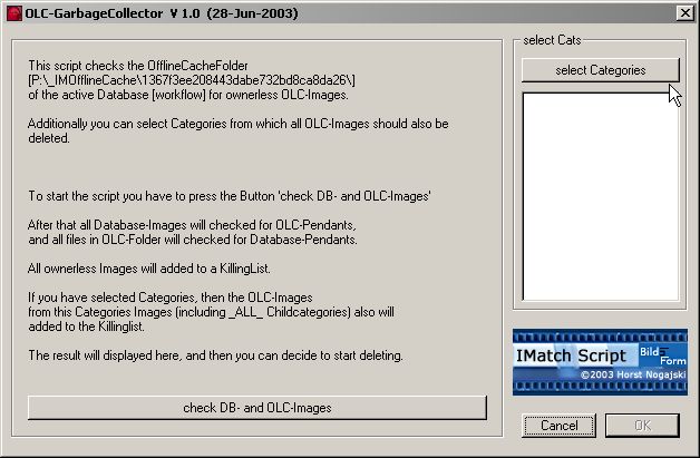 OffLineCache Garbage Collector V 1.0 (28-Jun-2003) - This script checks all existing Images in OfflineCacheFolder of the active Database and deletes ownerless OLC-Images. Additionally you can select some Categories from which you want delete the Images OfflineCache-pendants.